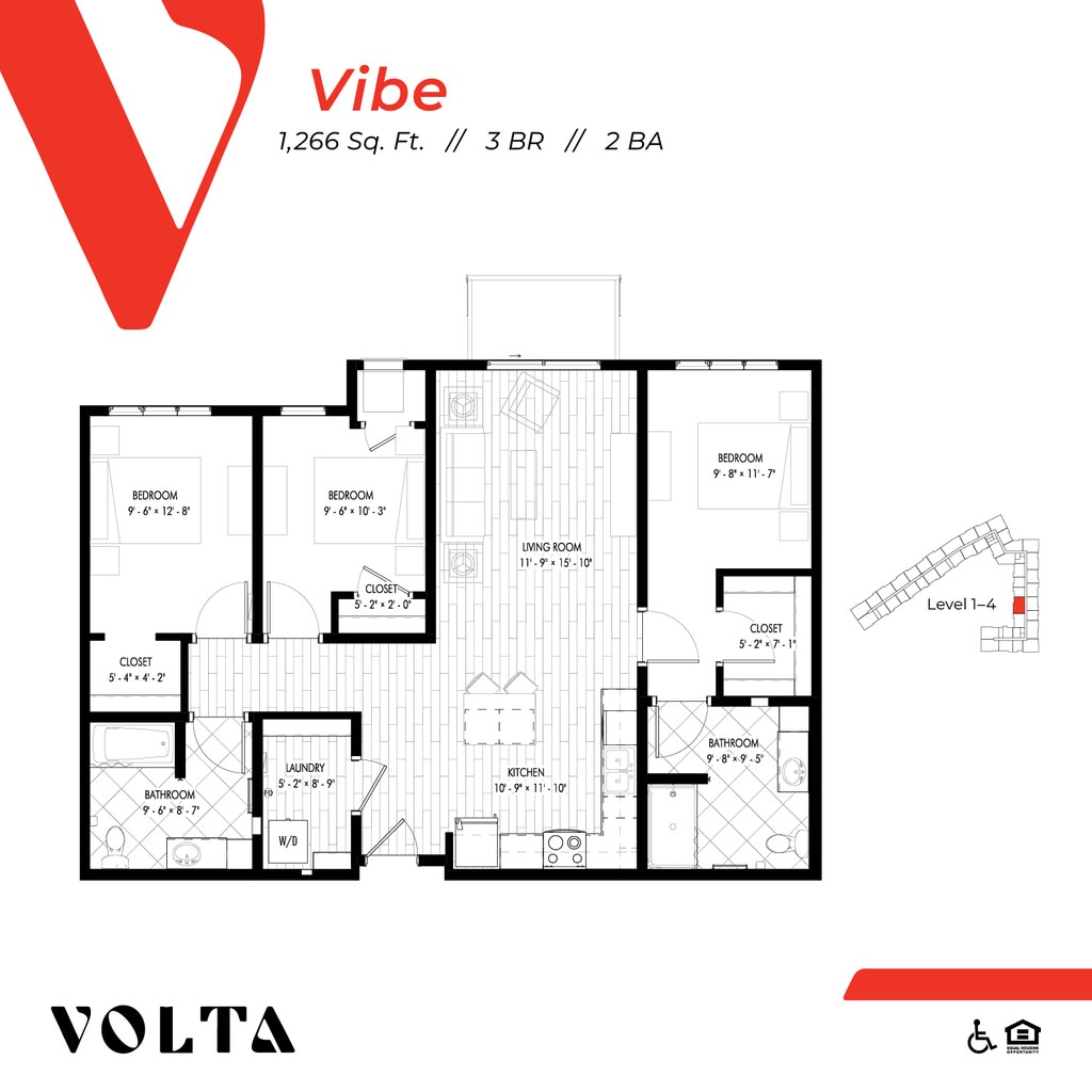 Apartment Model: Vibe$1,9343 Bedroom, 2 Bath, 1266 sq ftUnavailableFloor plans are artist's rendering. All dimensions are approximate. Actual product and specifications may vary in dimension or detail. Not all features are available in every rental home. Please see a representative for details.