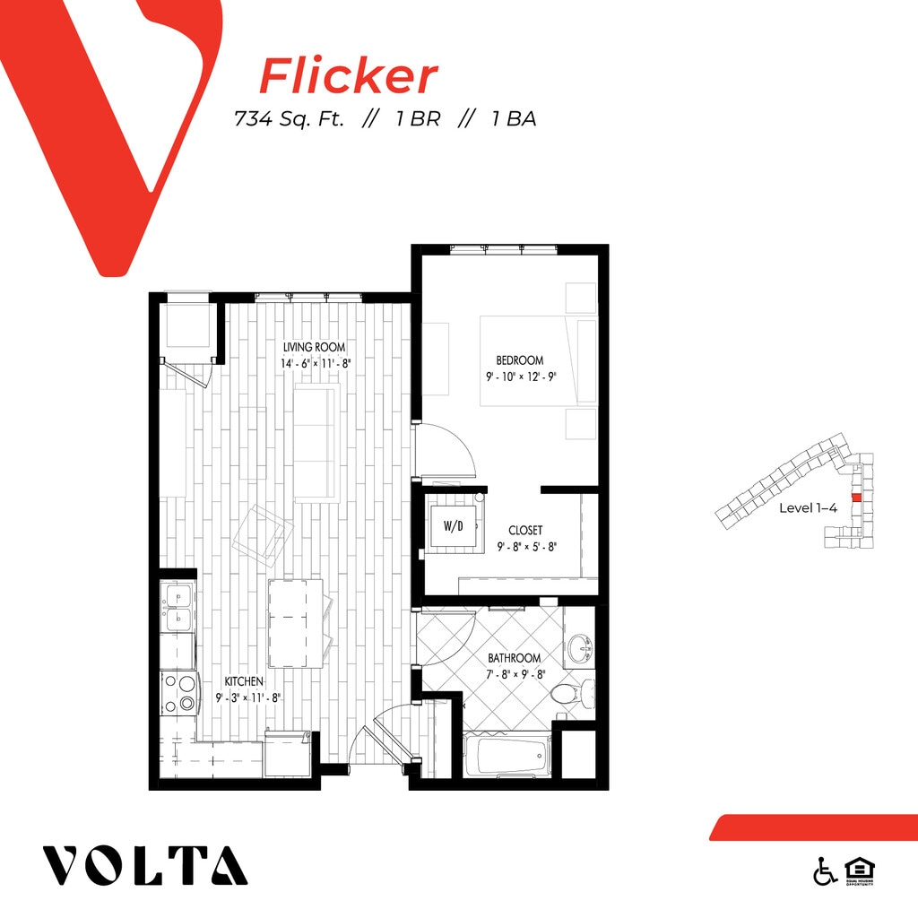 Apartment Model: Flicker$1,3941 Bedroom, 1 Bath, 734 sq ftUnavailableFloor plans are artist's rendering. All dimensions are approximate. Actual product and specifications may vary in dimension or detail. Not all features are available in every rental home. Please see a representative for details.