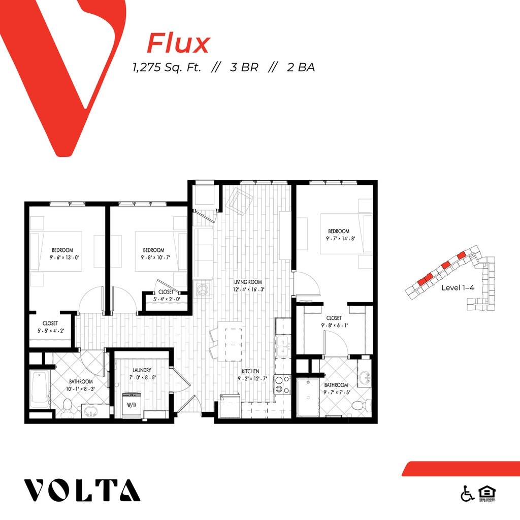 Apartment Model: Flux$1,9343 Bedroom, 2 Bath, 1275 sq ftUnavailableFloor plans are artist's rendering. All dimensions are approximate. Actual product and specifications may vary in dimension or detail. Not all features are available in every rental home. Please see a representative for details.