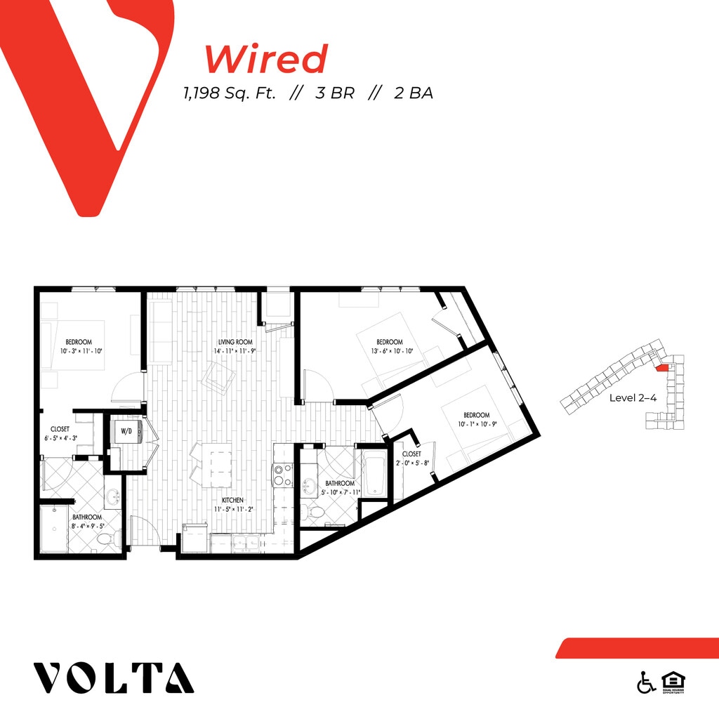 Apartment Model: Wired$1,9343 Bedroom, 2 Bath, 1198 sq ftUnavailableFloor plans are artist's rendering. All dimensions are approximate. Actual product and specifications may vary in dimension or detail. Not all features are available in every rental home. Please see a representative for details.