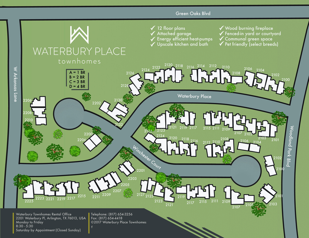Our spacious townhome rentals offer all the amenities of a home with a maintenance-free lifestyle. Enjoy one of the 13 unique architectural styles and floor plans Waterbury Place has to offerWaterbury Place is conveniently located 5 minutes away from Lake Arlington and is within commuting distance to both Fort Worth and Dallas. It is known for its quality schools, convenient amenities, and central location. If you’re looking for a unique, spacious, and well-maintained townhome for rent – book a visit to Waterbury Place now.Rent one of our premium townhomes located in Arlington, Texas. Waterbury Place is an upscale residential neighborhood conveniently located minutes from Lake Arlington and Lake Arlington Golf Course.Our spacious townhome rentals offer all the amenities of a home with a maintenance-free lifestyle. Enjoy one of the 13 unique architectural styles and floor plans Waterbury Place has to offer.