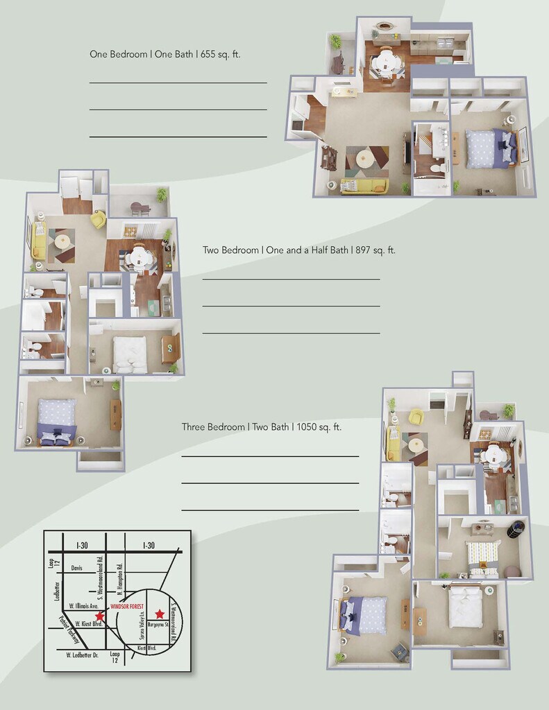 WINDSOR FOREST APARTMENTS offers 1 to 3 Bedroom apartments starting from $1,015 and having 655–1,040 sq ft. Here is the current pricing and availability: