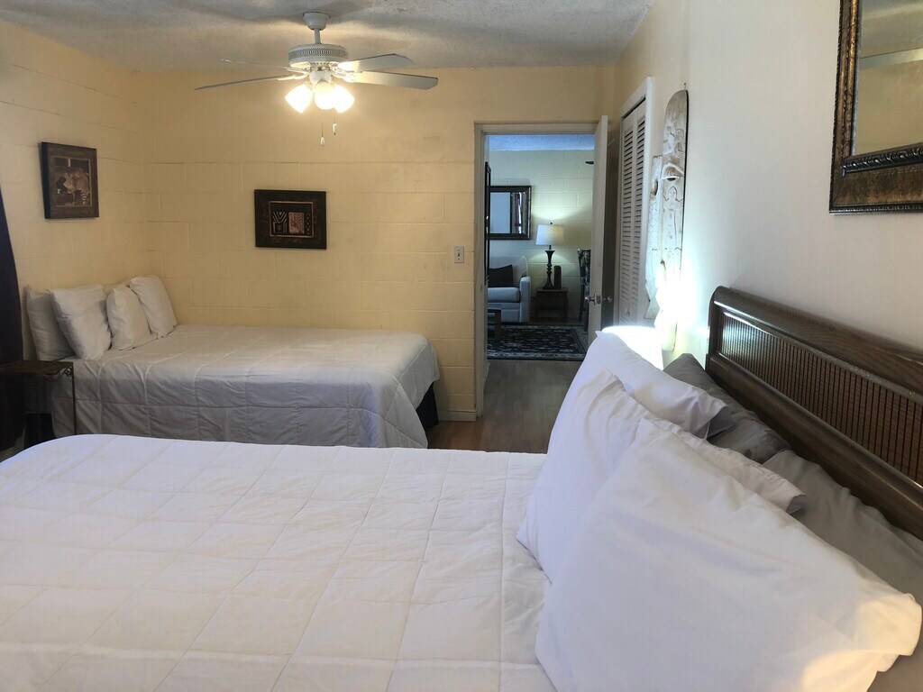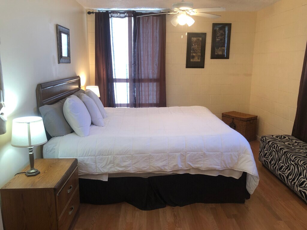 The Junior one-bedroom unit has a kitchenette with a double electric plate to cook on and pots and pans, plates, utensils, cups and glasses, microwave, coffee maker, toaster, etc. Refrigerator with a freezer, ceiling fan, air conditioning, a love seat, a queen-sized bed, a dining table with 3 chairs, coffee table, side lamps, flat screen TV, and ceiling-to-floor windows.