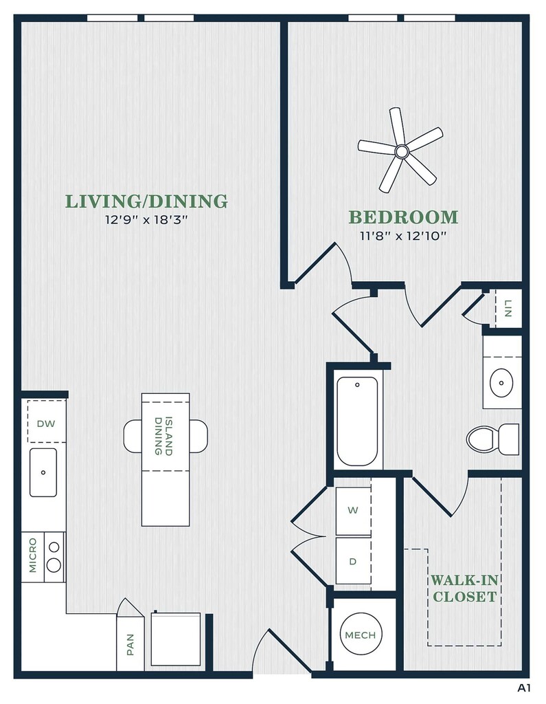 Apartment Model: A1From $1,2431 Bedroom, 1 Bath, 804 sq ftAvailable NowFloorplans3D Tours![]()