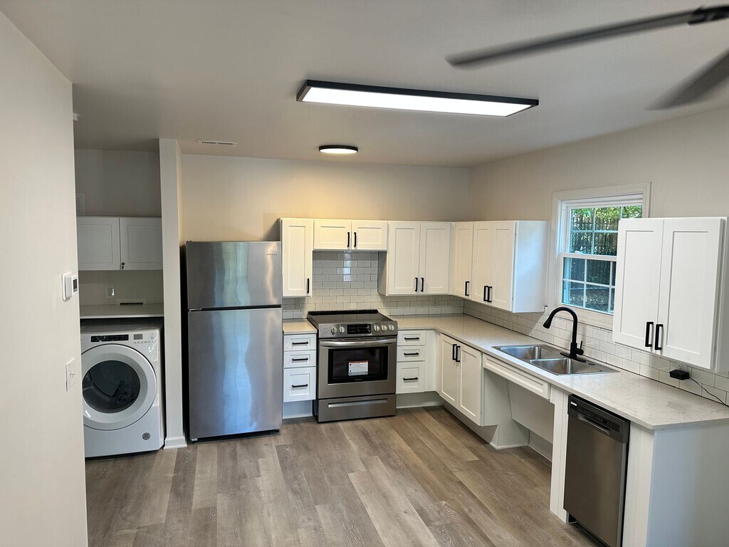 Large open living room and fully remodeled kitchen featuring NEW GE Stainless Steel appliances; refrigerator, dishwasher, range and microwave as well as brand new shaker cabinets, undermount sink with large sprayer faucet and stone countertops complimented with a subway tile backsplash. Floorplan includes three well-appointed bedrooms each with abundant natural light, walk-in closets and new ceiling fans. Both bathrooms were also newly renovated with stone vanities, mirrors, light fixtures and a rain showerhead. Additional details include new wide plank floors throughout, high ceilings, excellent closet space, new in-unit washer/dryer, central air and heat with digital thermostat, large windows and a free storage unit adjacent to your en-suite private balcony. Wallace Terrace is a boutique apartment complex with only 32 units and is conveniently located just 7 minutes from uptown and 9 minutes from South Park. Under new professional management, the property is currently rolling out newly renovated units that have been meticulously designed with the nicest finish package for two and three bedroom units at this price point in Charlotte.