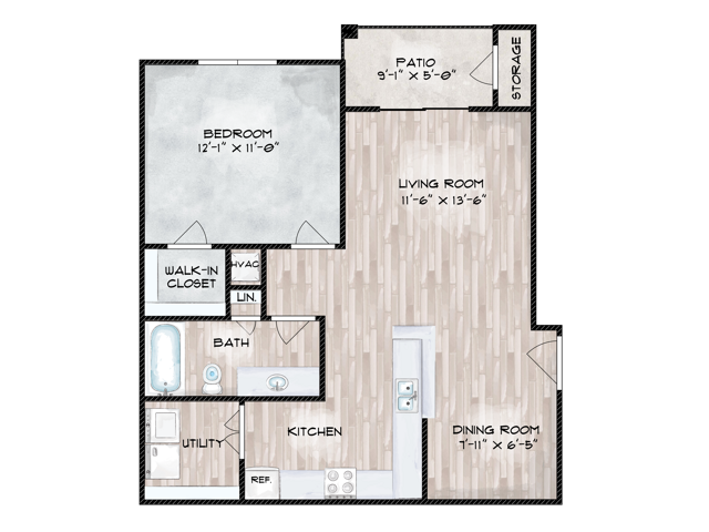 Apartment Model: 1 Bed, 1 BathFrom $1,0611 Bedroom, 1 Bath, 768 sq ftAvailable June 8, 2026Floor plans are artist's rendering. All dimensions are approximate. Actual product and specifications may vary in dimension or detail. Not all features are available in every rental home. Please see a representative for details.