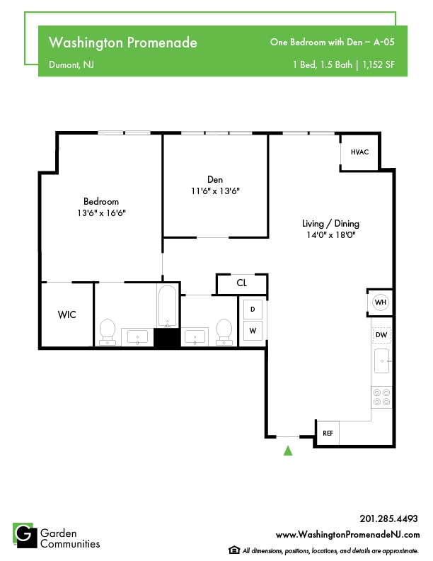 Apartment Model: $2.87/sq.ft. - One Bedroom with Den A-05$3,3101 Bedroom, 1.5 Bath, 1152 sq ftUnavailable$2.87/sq.ft. - One Bedroom with Den A-05 - Floorplan 1 2 Bedrooms