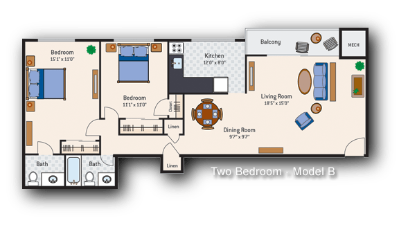 Apartment Model: 2 Bedroom 1.5 Bath Type BCall For Rates2 Bedroom, 1.5 Bath, 901 sq ftUnavailableFloorplansPhotos![]()
