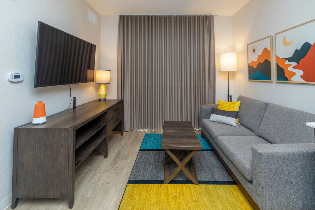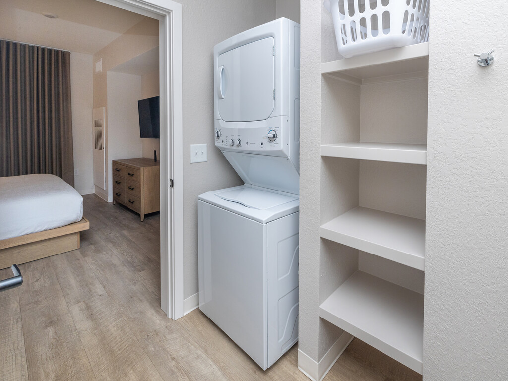 Spacious two-bedroom suite freshened with natural light and arranged in a cool neutral palette with an open concept living area. Enjoy an in-room washer/dryer, a fully-equipped kitchen, a bright bathroom, and a closet system structured to declutter.