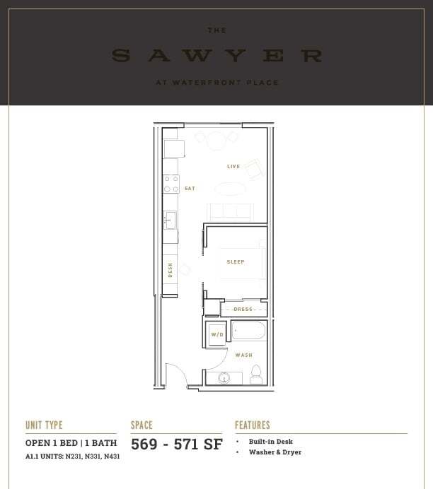 Two brand new buildings, one luxury experience. Discover the best of the Everett waterfront with two beautiful communities boasting waterfront views and a variety of spacious, stylish layouts. Youll get to choose but you wont have to settle. Community amenities at Waterfront Place Apartments abound, with unparalleled luxury spaces designed for your elevated comfort and convenience. From the spiral staircase in the two-level lobby space at The Sawyer to the breathtaking Puget Sound views from the roof terraces atop both buildings, you'll find room to relax and unwind in some of the Pacific Northwest's most beautiful settings. Residents also enjoy a true resort-style living experience with access to full-time, on-site staff to assist with special requests, amenity reservations, neighborhood activity recommendations and more. Waterfront Place, the communitys new go-to gathering place, will also feature excellent restaurants and retail lining the newly renovated boardwalk featuring views of the marina, bay and the mountains beyond. Be one of the first to call the Everett waterfront home!