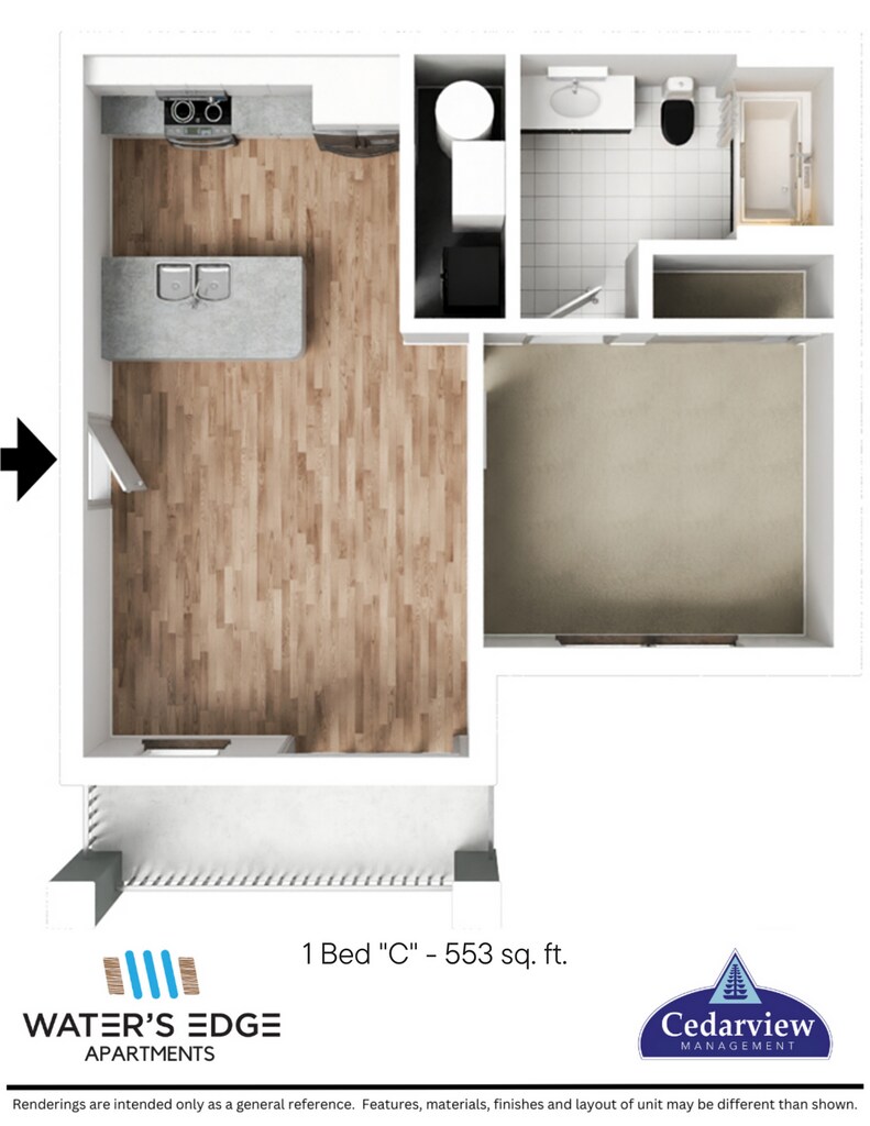 Apartment Model: 1 BED C1 Bedroom, 1 Bath, 553 sq ftAvailable NowFloorplansPhotos![]()