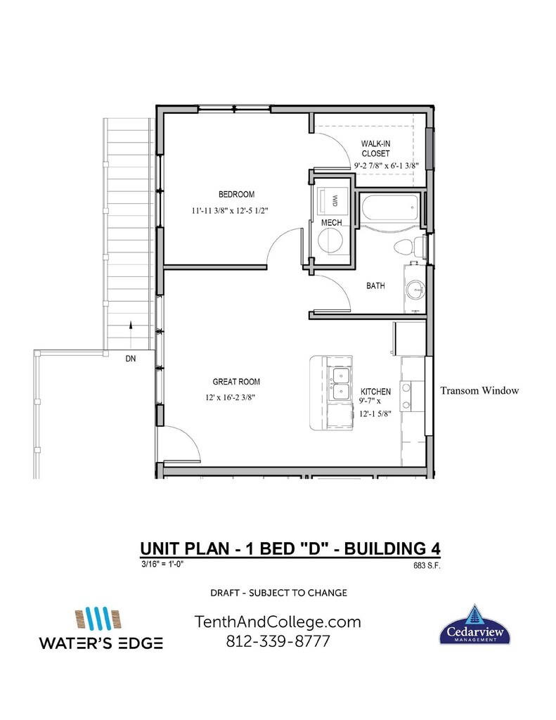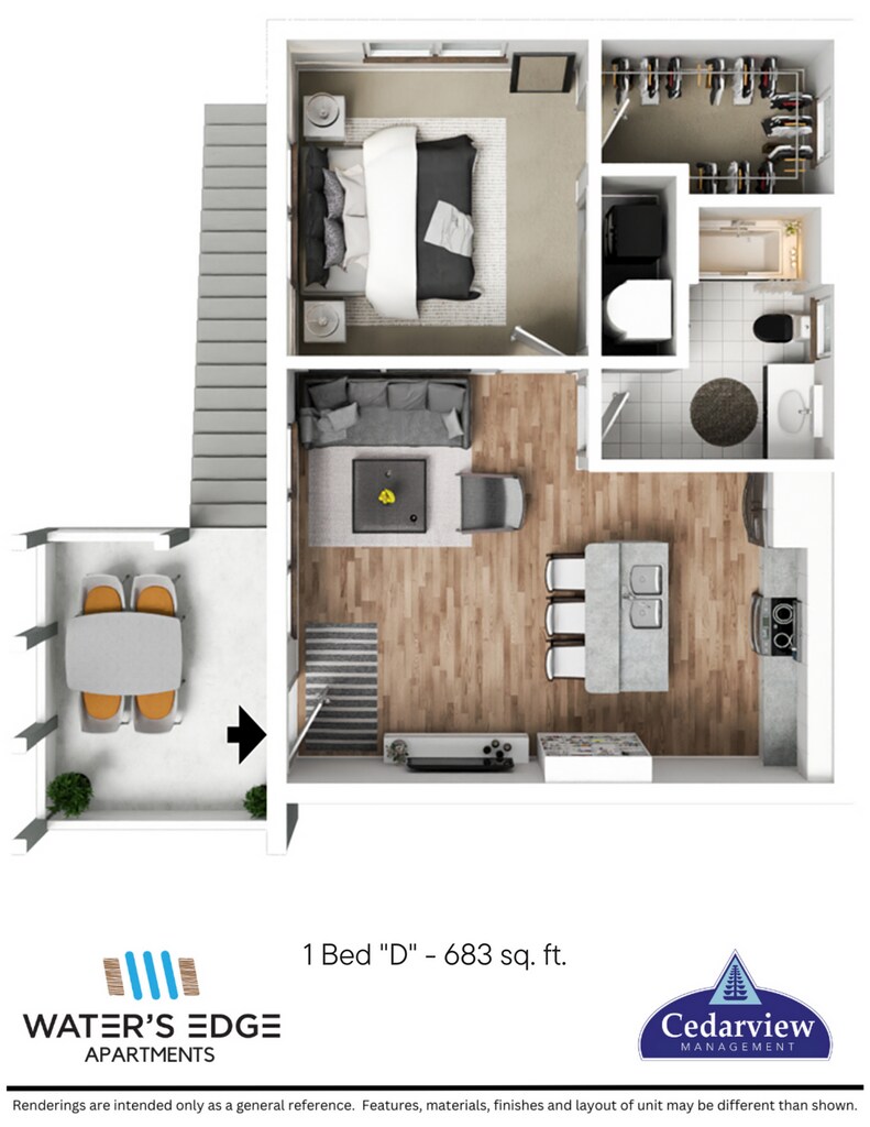 1 BED D - Floorplan 11 Apartment Unit: 4201Apartment Model: 1 BED D1 Bedroom, 1 Bath, 683 sq ftAvailable NowOPEN FLOOR PLAN ONE BED A