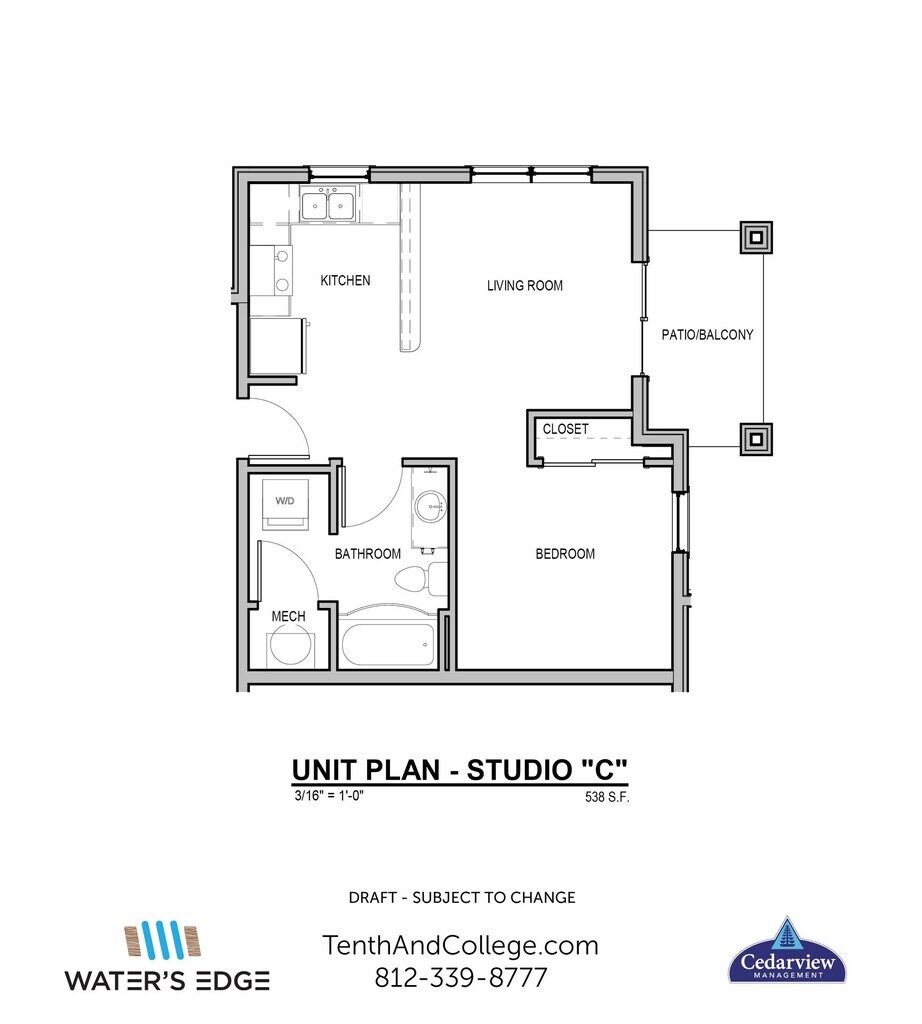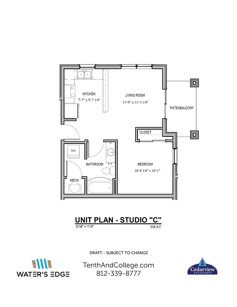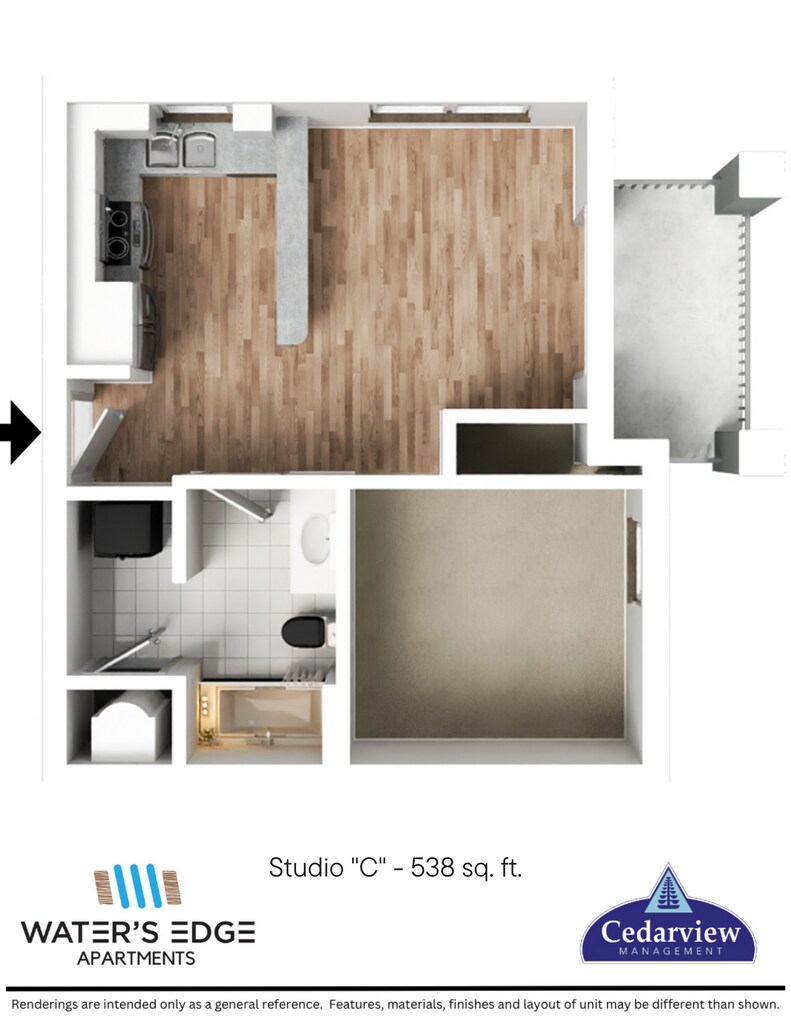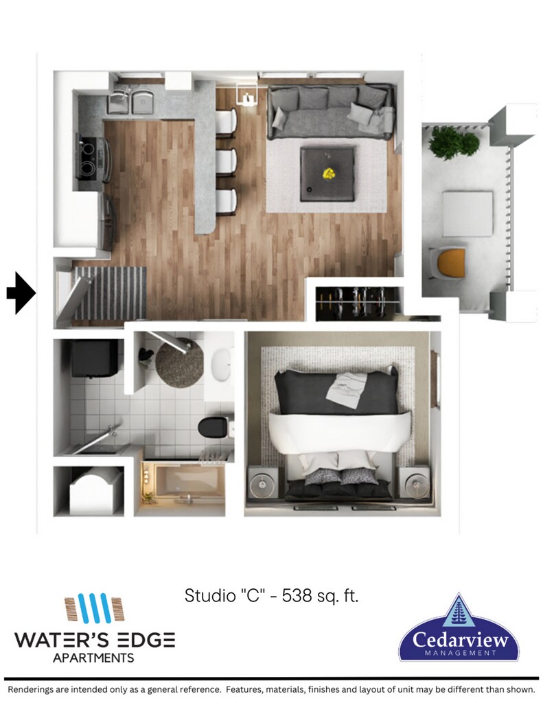 STUDIO C - Floorplan 14 Apartment Unit: 2302Apartment Model: STUDIO CStudio, 1 Bath, 538 sq ftAvailable Now1 Bedroom