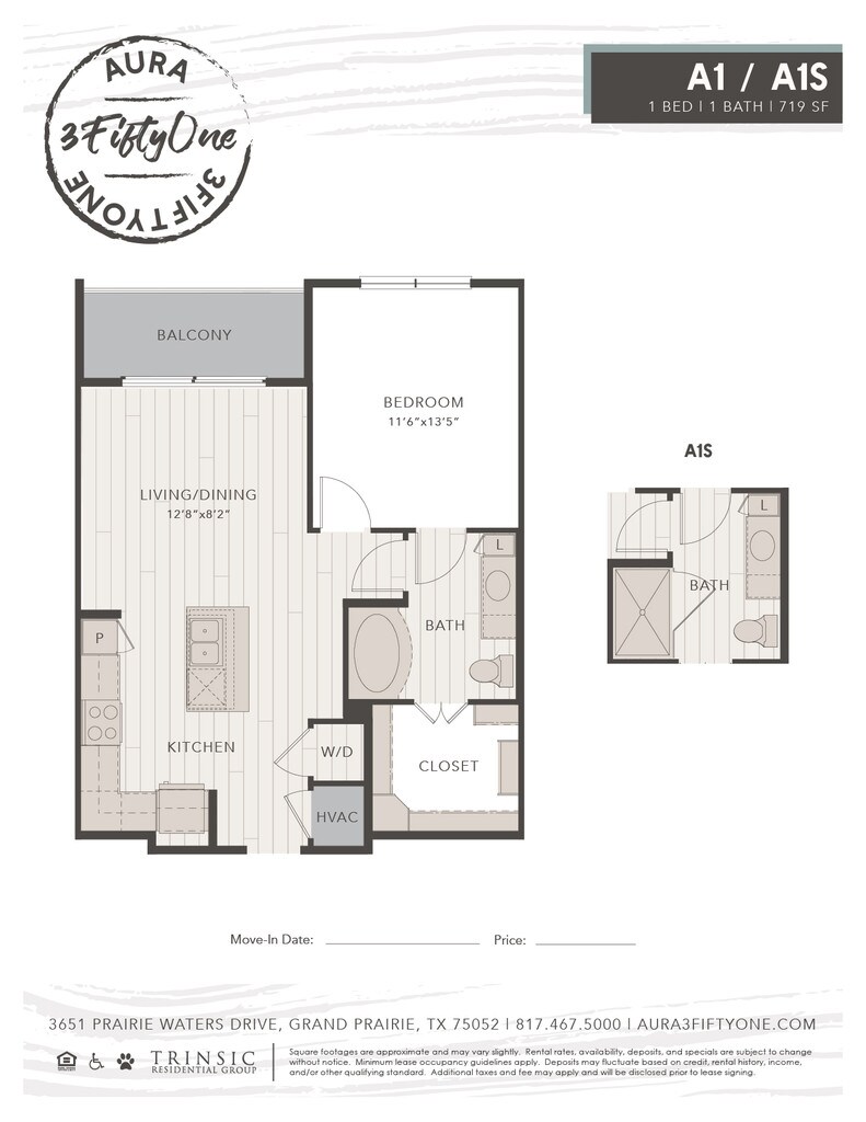 A1 and A1S - Floorplan 2 Apartment Unit: 4110Apartment Model: A1 and A1S$1,5371 Bedroom, 1 Bath, 719 sq ftAvailable NowApartment Unit: 5319Apartment Model: A1 and A1S$1,3221 Bedroom, 1 Bath, 719 sq ftAvailable January 28, 2026A2 and A2S