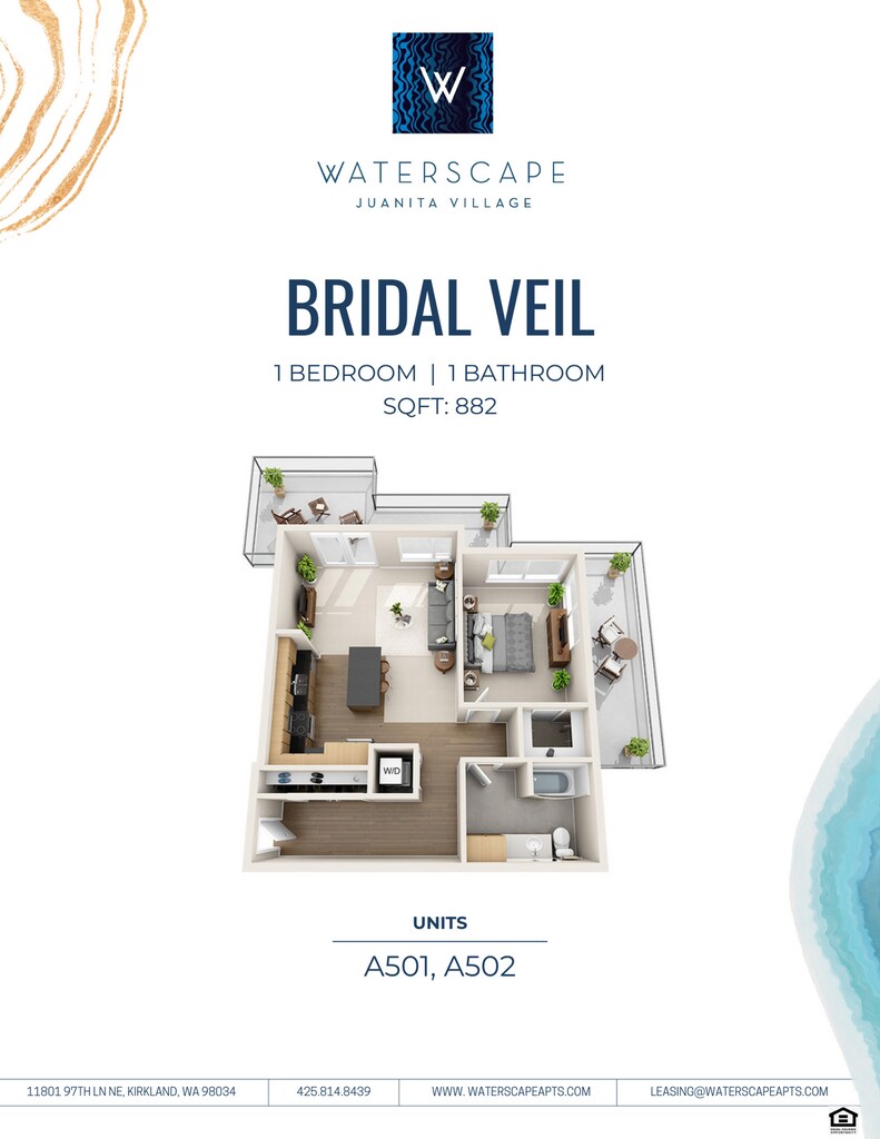 Bridal Veil - Floorplan 1 Apartment Unit: A502Apartment Model: Bridal Veil$3,3501 Bedroom, 1 Bath, 882 sq ftAvailable Now2 Bedrooms