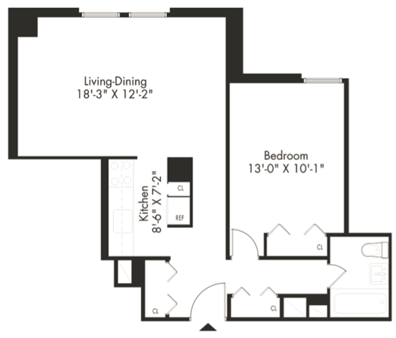 1H Renovation 5 - Floorplan Apartment Unit: 30-36BApartment Model: 1H Renovation 51 Bedroom, 1 Bath, 691 sq ftAvailable Now1K Renovation 5