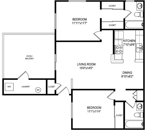1+1 Down - Floorplan 11 Apartment Unit: 107Apartment Model: 1+1 Down$2,0751 Bedroom, 1 Bath, 637 sq ftAvailable Now2 Bedrooms