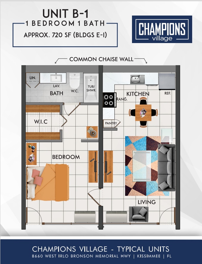Nestled in the heart of Kissimmee, Champions Village offers the ideal place to call home. Enjoy the convenience of being just steps away from supermarkets, shops, restaurants, and more, with easy access to I-4 and Disney for effortless commuting. Our newly remodeled units feature modern upgrades, including stainless-steel appliances, stylish light fixtures, wood and tile flooring, plush new carpeting, granite countertops, spacious walk-in closets, linen closets, large windows, wireless and cable-ready connections. Step outside to beautifully landscaped walkways, three sparkling swimming pools, a recreational area, on-site laundry facilities, a fully equipped fitness center, and cozy fire pits. Plus, we’re a pet-friendly community—restrictions may apply. Discover affordable luxury and unbeatable value at Champions Village. Schedule a tour today! E: P: