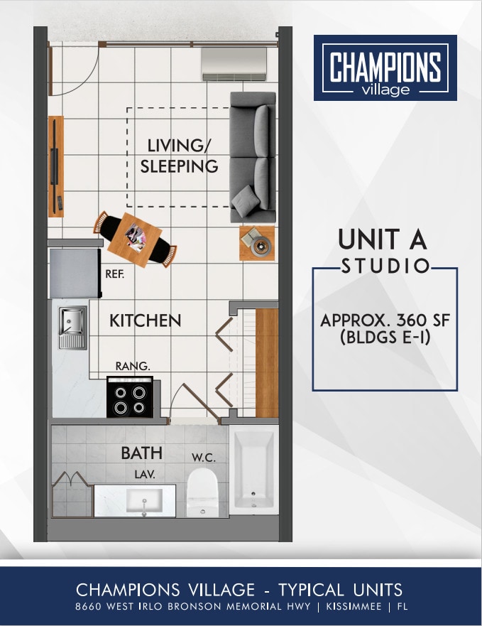 Welcome to Champions Village offers Studio apartments starting from $895 and having 360 sq ft. Here is the current pricing and availability: