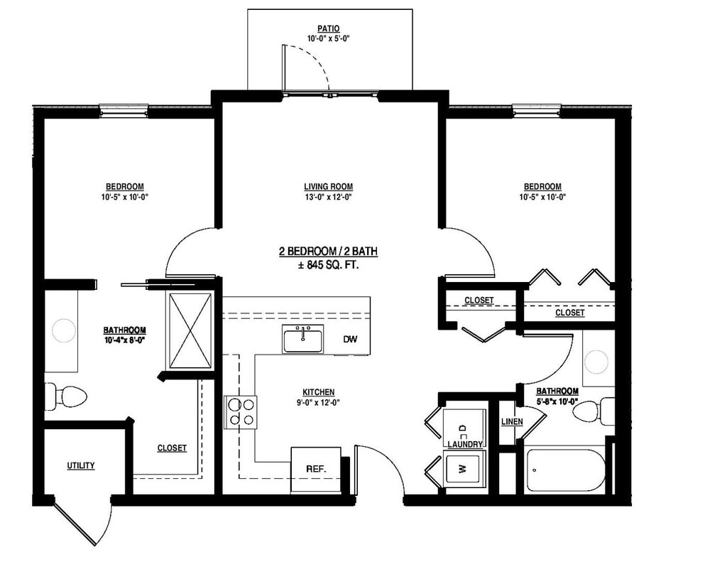 Apartment Model: 2/2$1,2502 Bedroom, 2 Bath, 845 sq ftAvailable Now![]()