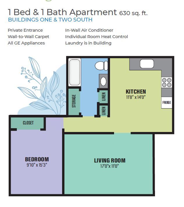 Apartment Model: One Bedroom-BLDG 1 & 2$1,1001 Bedroom, 1 Bath, 630 sq ftUnavailable![]()