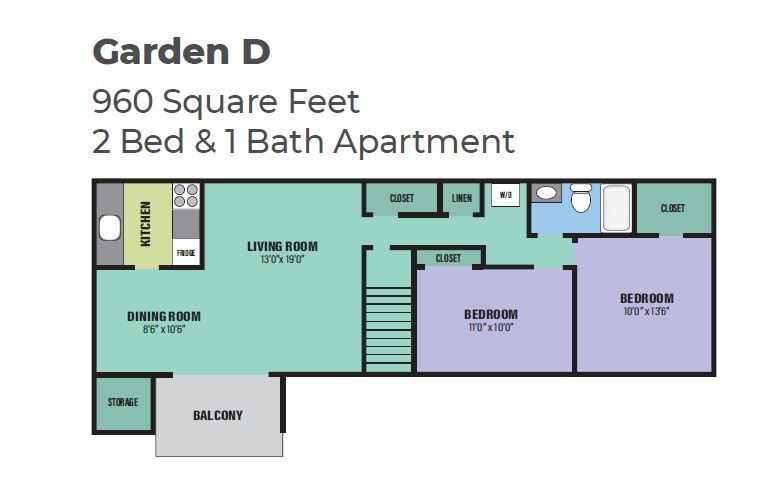 Apartment Model: Garden D$1,3502 Bedroom, 1 Bath, 960 sq ftUnavailable![]()