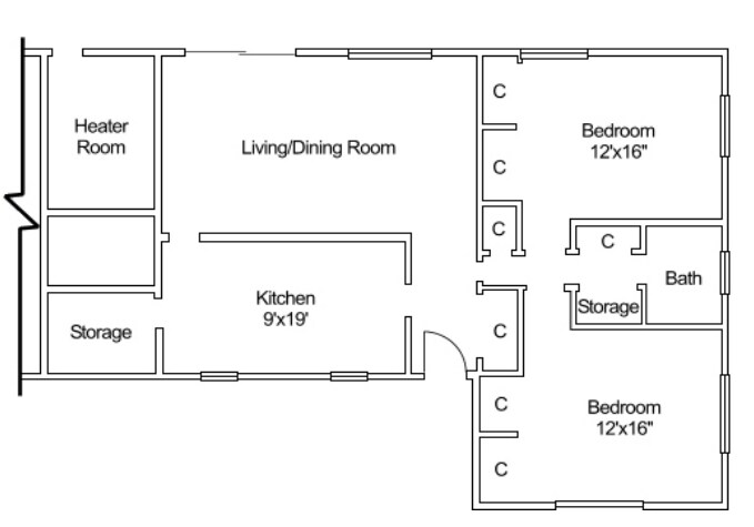 2 Beds, 1 bath - Floorplan 1 2 Beds, 1 bath