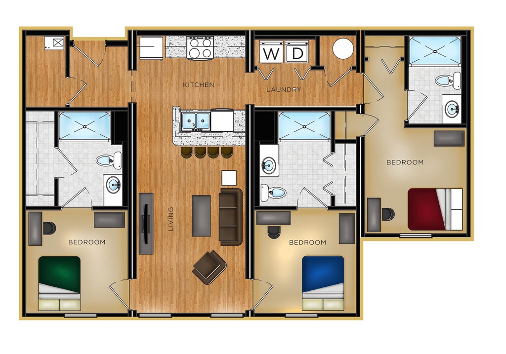 Apartment Model: P2 3 Bed1 Bedroom, 1 Bath, 355-366 sq ftAvailable Now![]()