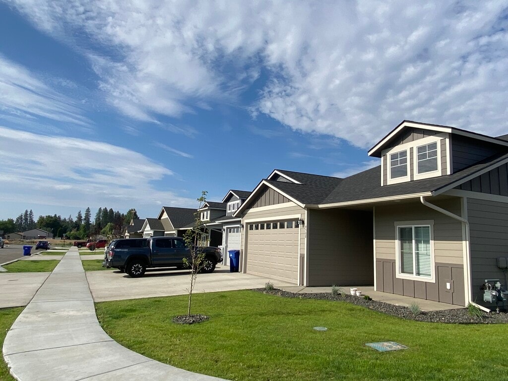 Now leasing for August— three-bedroom, two-bathroom duplex-style rental homes with spacious single-level floor plans, located just off the Geiger exit in Spokane, Washington. Nestled in a quiet setting surrounded by green meadows and scenic views, this community offers the perfect mix of tranquility and convenience. Just five minutes from Spokane International Airport, ten minutes from the new Amazon facility, and fifteen minutes from Fairchild Air Force Base, our location makes commuting a breeze. Each home features high-end finishes including quartz countertops, stainless steel appliances, wood grain LVP flooring, gas forced air heating, and central air conditioning. Enjoy the privacy of a fully fenced backyard, the ease of an attached two-car garage, and the added benefit of professional landscaping services included with every home. Experience the comfort and style of single-level living in a beautifully designed, modern duplex community.