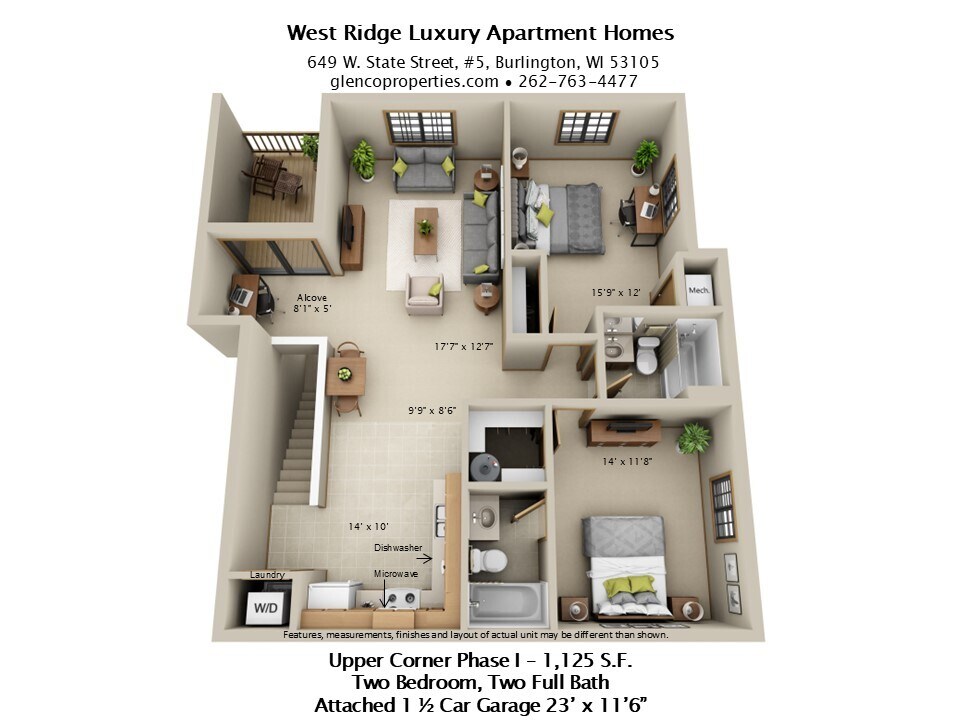 West Ridge offers you luxury living, while freeing you from the burdens and commitment of home ownership. Relax and enjoy your apartment home which was designed with your comfort, privacy, and convenience in mind. West Ridge has a spacious and open concept floor plan for you to enjoy luxury living. Please call West Ridge for more information. We offer: -Spacious two bedroom apartments with two full bathrooms -A complete appliance package: Refrigerator, self-cleaning electric range, dishwasher, and built-in microwave -Full size washer and dryer in apartment -All buildings smoke free -Balconies / Patios on select units -Plush carpeting -Certain styles have cathedral ceilings and Private entry -Mini-blind window treatments -Professional on-site management and maintenance -Extra Assigned parking space -Walk-in closet -Your cats are welcome! Some restrictions apply. We are located near Lake Geneva, Twin Lakes, Rochester, Union Grove, Muskego, Elkhorn, Waterford and Lyons.