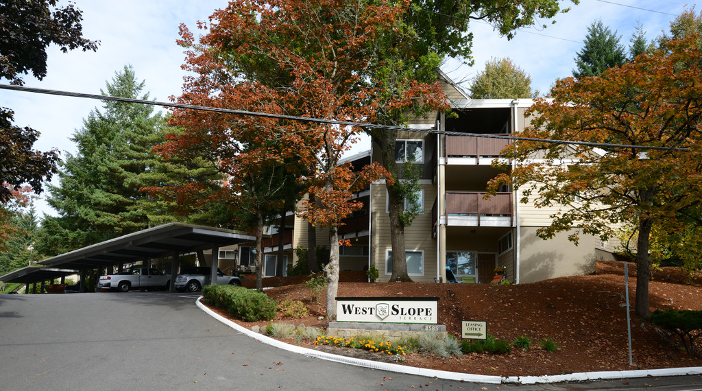 Experience all the best that Portland has to offer at West Slope Terrace, located just 10 minutes outside of the city in the serene West Slope neighborhood. West Slope Terrace is your oasis away, but it’s so close to shopping, restaurants, transit, and all the necessities of life that going out for a fun day in town or even just running errands will be a breeze and a joy. Right on the property you have the luxury amenities of a crystal clear pool, relaxing sauna, and fully equipped fitness center. West Slope Terrace is surrounded on all sides by trees and greenery, and we’re always updating the landscape with seasonal flowers and plants. Move in soon and you’ll be here when the tulips bloom and the rose garden comes to life! Come tour our community and fall in love with our incredibly large and spacious apartments with tons of storage space and beautiful views. The beauty and benefits of these apartments has to be seen to be believed, so call or email today to speak to our friendly leasing staff about scheduling a tour of your new home. We look forward to meeting you!