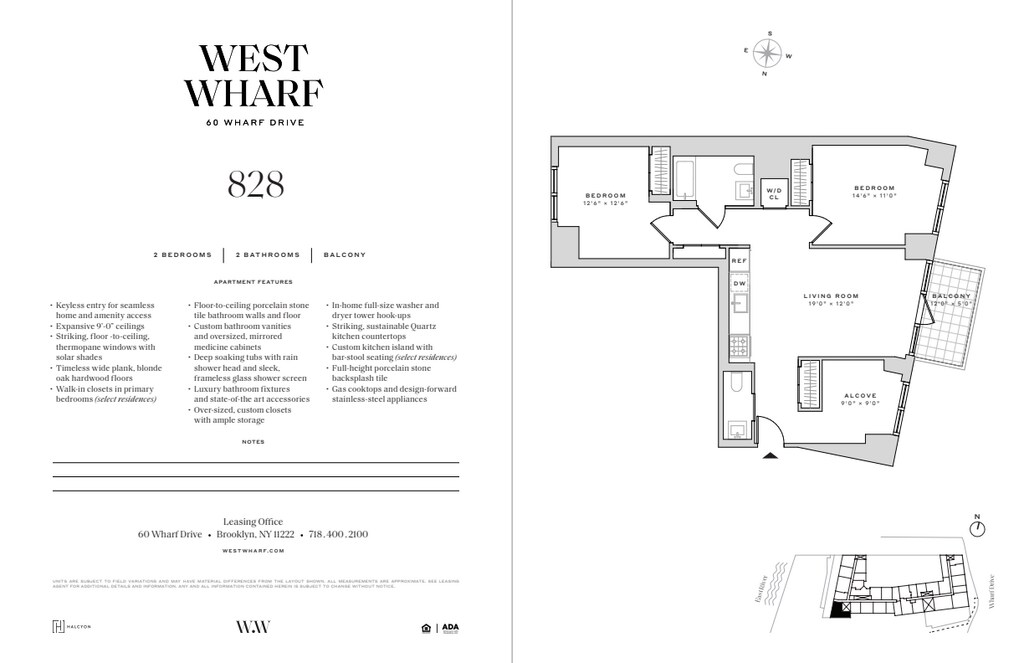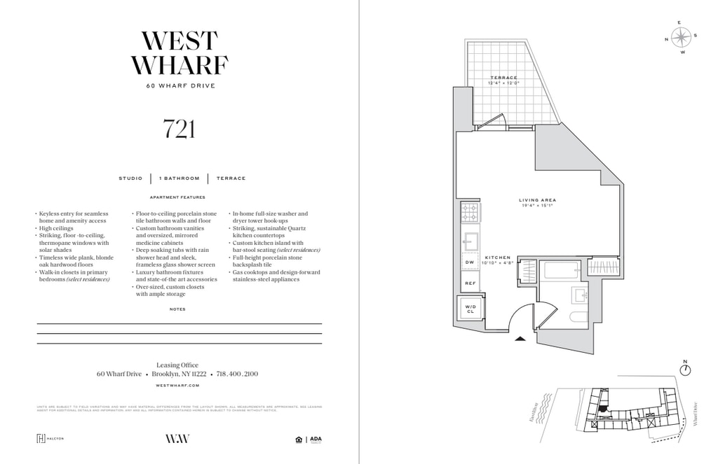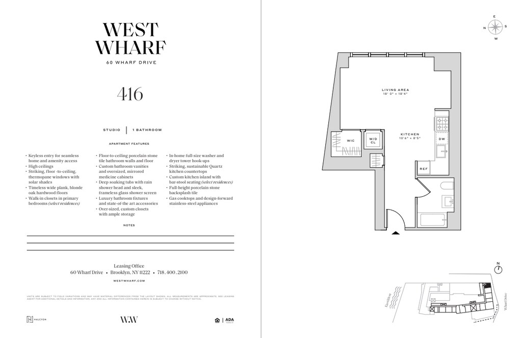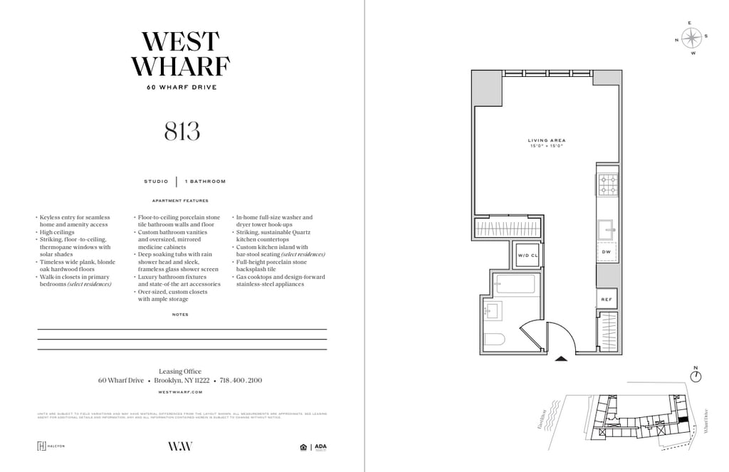 60 Wharf Drive, a 40-story luxury residential rental tower, is the newest addition to West Wharf, New York City’s premier waterfront destination at the crossroads of Brooklyn’s historic Greenpoint and Williamsburg neighborhoods. Our elegant new glass and steel tower pairs a vibrant mix of studio, one-, two-, and three-bedroom luxury rental residences, many of which include private balconies, with an unmatched variety of health and wellness, play, and work-from-home amenities designed to inspire and enrich your lifestyle. 60 Wharf Drive living is defined by spacious apartment layouts, elegant finishes, and well-crafted finishes. Each pet-friendly residence offers keyless entry for seamless home and amenity access, 9’-0” ceilings (14’-0” ceilings in select residences), floor-to-ceiling windows for immersive views and daylight filled rooms, high-performance individual HVAC climate control for year-round comfort, wide-plank blonde oak hardwood floors, custom kitchen islands with bar-stool seating (select residences), luxury fixtures, gas cooktops, design-forward stainless-steel appliances, deep soaking tubs, rain shower heads, frameless glass shower screens and primary bedroom walk-in closets (select residences). Indulge in Harbor House, West Wharf’s membership offering of more than 100,000 sf of spectacular luxury amenities accented by stunning skyline views. Highlights of Harbor House’s indoor amenity offerings include: a swimming pool and children’s walk-in wading pool with East River views; a fitness center with state-of-the-art workout equipment and climbing wall; a yoga studio; a full basketball court with practice half-court hoops; (2) PGA golf simulators; a bowling alley; a children’s playroom; a spa including hammam and salt rooms, saunas, steam rooms, hot tub, treatment rooms, experience shower and more; a wood-paneled billiards room and lounge; dog-grooming stations; a podcast recording / music room; a teen game room; (2) screening rooms with an adjoining lounge; a demonstration kitchen; a reservable party room with catering kitchen; and a co-working hub with collaboration spaces, private conference rooms, and breakout areas. Highlights of Harbor House’s outdoor amenity offerings include: a rooftop swimming pool with sunset lounge and bar; a landscaped outdoor children’s play area with water feature; a terrace wellness lounge; barbecue grills, a stunning waterfront esplanade park with seating and modern picnic tables; ample outdoor green areas for jogging, relaxing, and enjoying breathtaking Manhattan skyline views; and Wharf Plaza, a tree-lined plaza with seating. Additional building conveniences include: a 24/7 Concierge; an on-site building management and maintenance team; storage rooms for lease; complimentary bicycle storage; staffed package room; valet; a state-of-the art laundry room with lounge seating; multiple oversized elevator cabs; Wharf Drive, a private drive for lobby drop-off by car; an in-building parking garage with charging stations; a dedicated loading dock and elevator for ease of move-in; and a complimentary flat TV and picture hanging move-in service. Located at the crossroads of Brooklyn’s historic Greenpoint and Williamsburg neighborhoods, West Wharf thrives on a vibrant mix of local green and waterfront parks, shops, galleries, and restaurants ready to explore. West Wharf is accessible by the G and L subway lines; B24, B32 and B43 bus routes; and the NY Ferry (Greenpoint and North Williamsburg stops). Tenants are responsible for: Application fee of $20 per each Applicant, Occupant, and Guarantor 1st Months' Rent and 1 Months Security Deposit Pet Fee of $350 per pet if applicable Wire Transfer, Notary, and Bank Check fee if applicable
