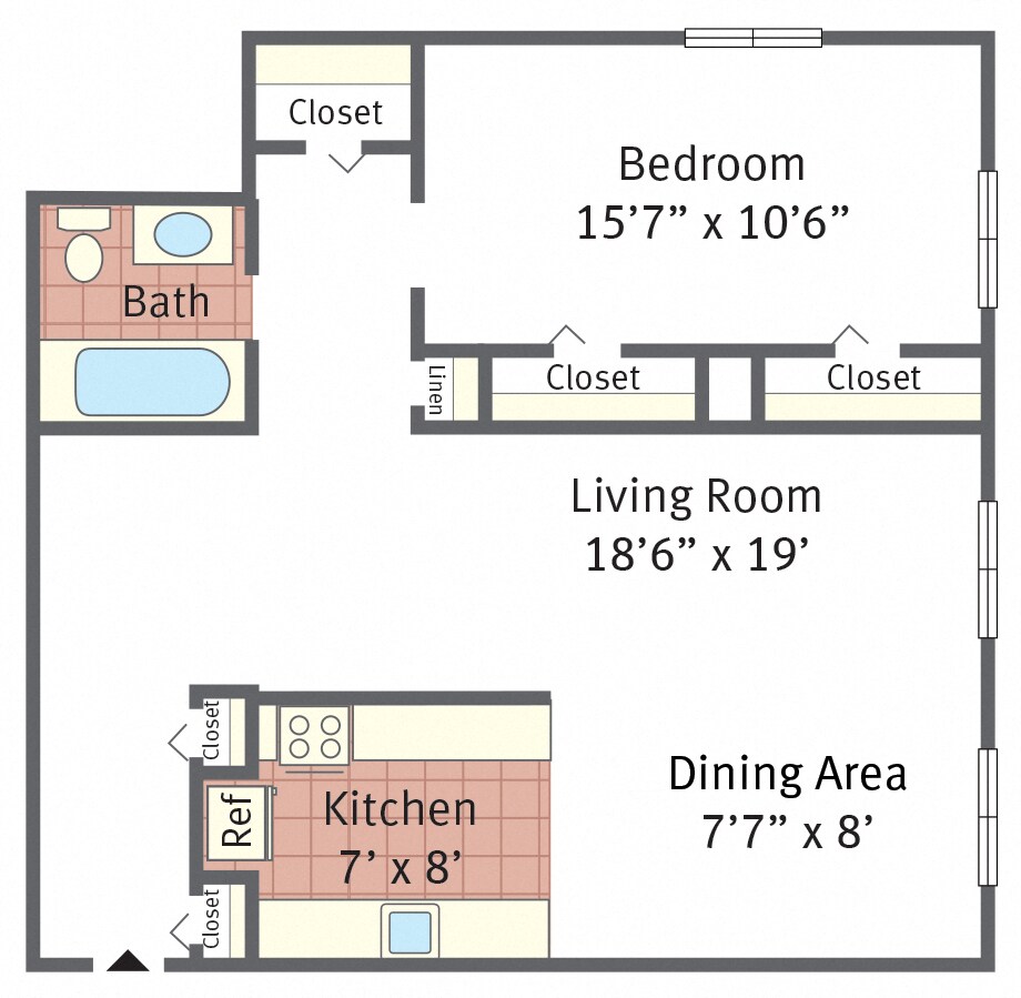 Availability Date Unit Sq Ft Call for Availability One Bedroom 680 sq ft Apartment Model: One BedroomCall For Rates1 Bedroom, 1 Bath, 680 sq ftUnavailable![]()