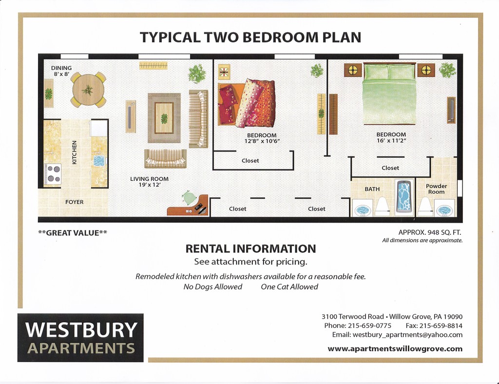 Westbury offers 1 to 2 Bedroom apartments starting from $1,538 and having 760–948 sq ft. Here is the current pricing and availability: