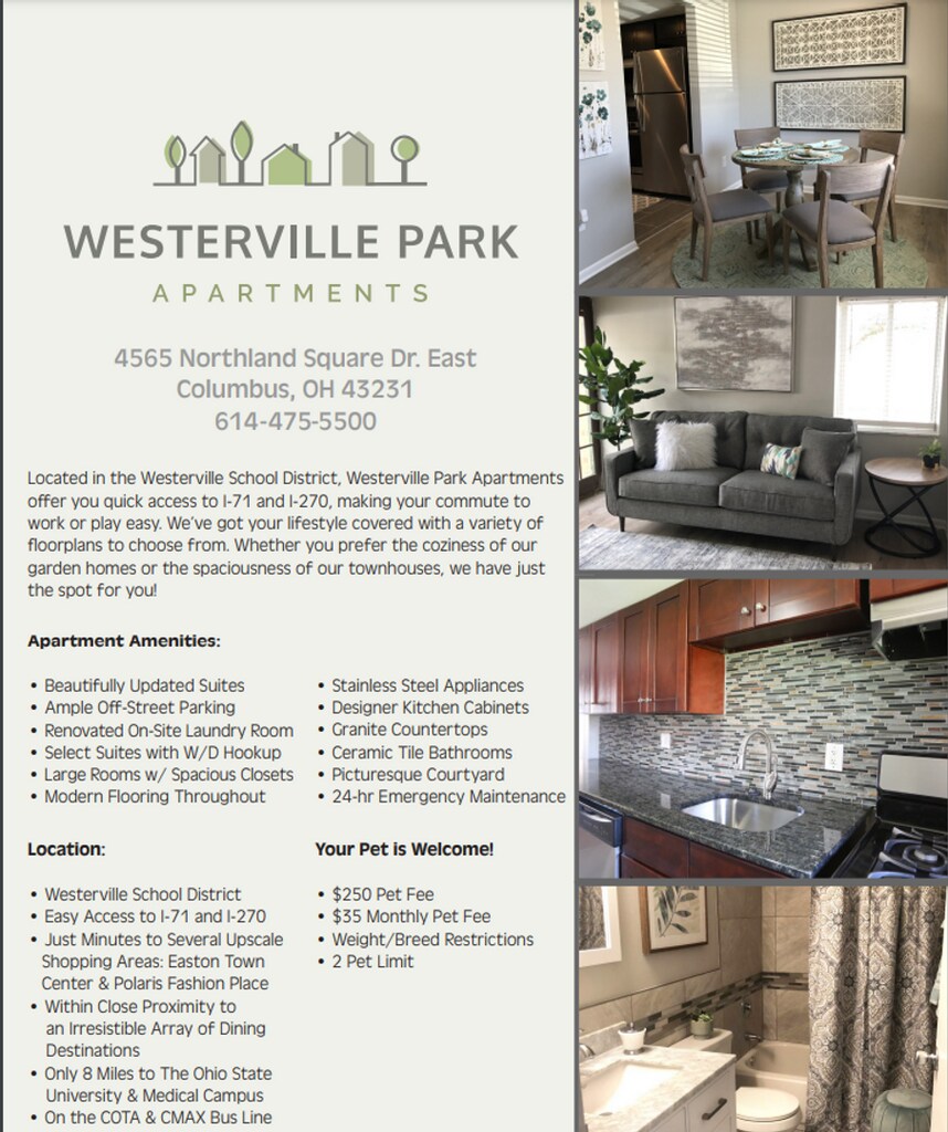 Located in the Westerville school district.... Westerville Park Apartments offers you easy access to major freeways. Minutes from Easton Town Center, shopping, dinning, and entertainment for you to enjoy your life to the fullest! Our friendly management team will make you feel right at home the moment you step through the door. All of our apartment homes have been renovated and feature soft touch cabinets, granite countertops, modern light fixtures. We are pet friendly, although there are breed and size restrictions. Call us for more information about our community!