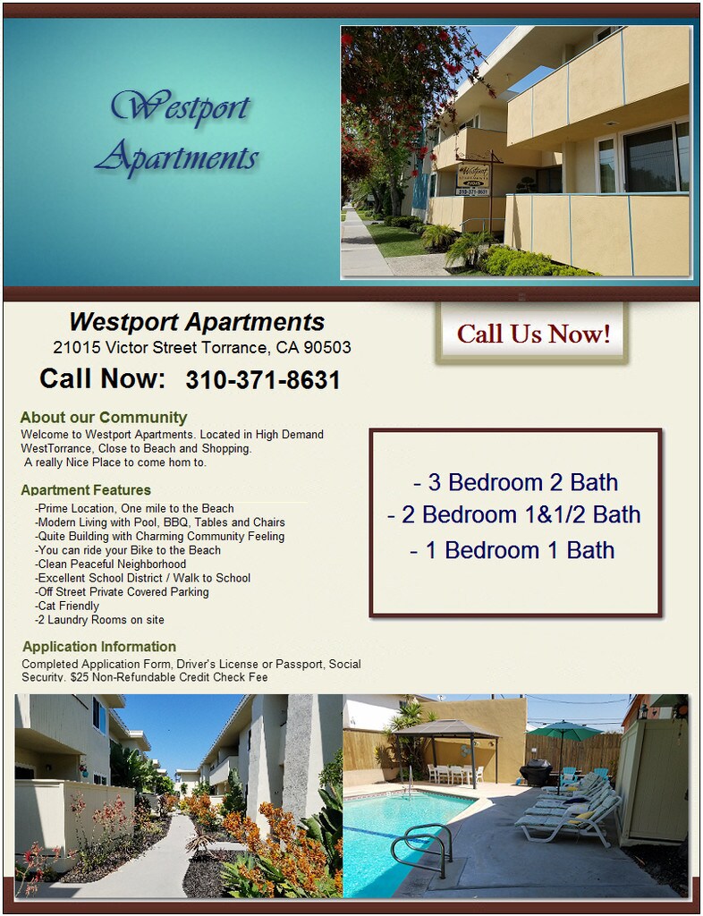 -1 mile to the Beach! -Beautiful Quiet Building -Hardwood Floor Unit with Patio -Ride Your Bike to the Beach! [About Our Community] Welcome to Westport Apartments. Located in High Demand West Torrance, Close to Beach and Shopping A really Nice Place to come home to [Apartment Features] -Prime location -Modern Living with Pool , BBQ, Tables and Chairs -Quiet Building with Charming community feeling -You can ride your Bike to the Beach -Clean Peaceful Neighborhood -Excellent School District/ Walk to School -Off street Private Covered Parking -Cat Friendly -2 Laundry Rooms on site