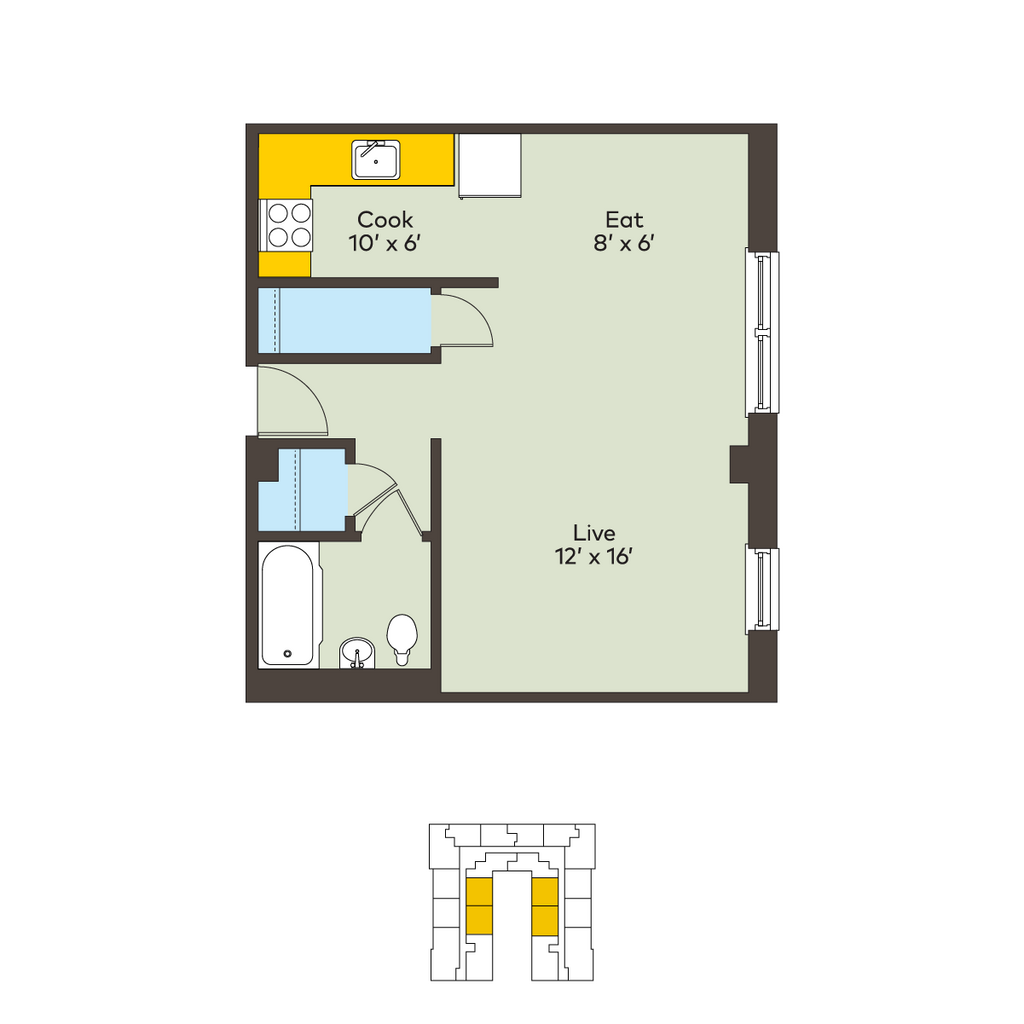 Apartment Model: 301w-0bdCall For RatesStudio, 1 Bath, 412 sq ftUnavailable301w-0bd - Floorplan 1 301w-0aa