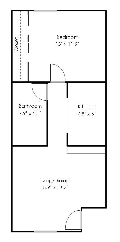 1 Bed, 1 bath - Floorplan 1 2 Bedrooms