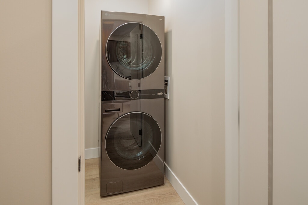 This large furnished 2-bedroom 1 bath has ? Air conditioning ? Corner unit • Smooth top cooktops and stainless-steel appliances • Walk-in closet • Large in-suite washer & dryer • High ceilings • Secured key fob entrances • Parcel locker in lobby • Electrical vehicle charging stations • underground parking • Bike storage • Hot water included • On-site management This is a smoke free building.