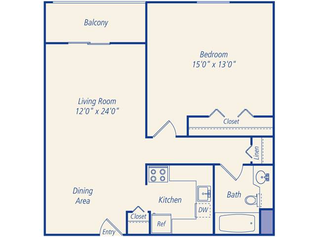 1 Bed, 1 Bath, 633 sq ftPlus FeesAvailable NowLargest 1 BedroomThis is the largest 1 Bedroom at this PropertyModel Gallery