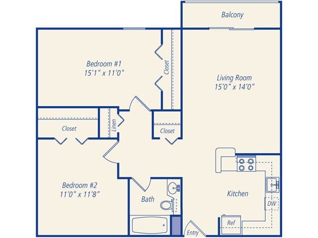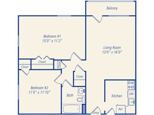 2 Beds, 1 Bath, 894 sq ftLargest 2 BedroomThis is the largest 2 Bedroom at this PropertyModel Gallery