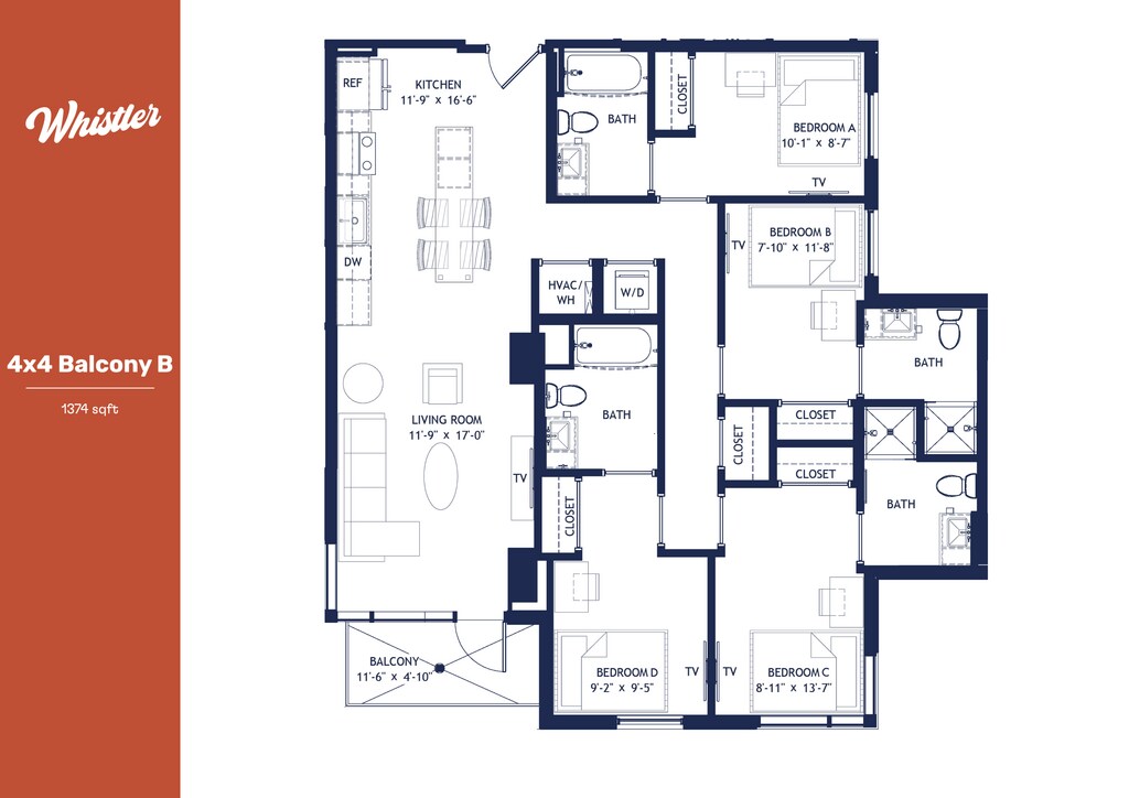 4 Beds, 4 Baths, 1374-1385 sq ftAvailable August 16, 2026Largest 4 BedroomThis is the largest 4 Bedroom at this PropertyModel Gallery