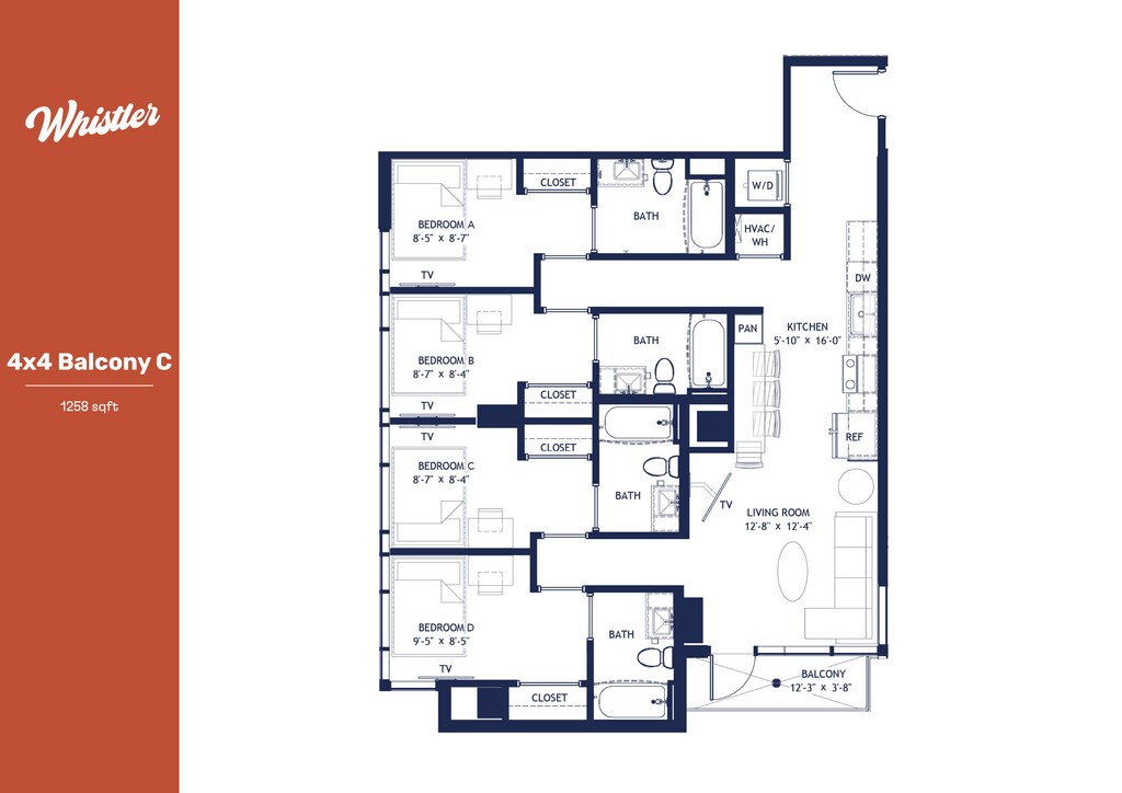 4x4 - Floorplan 1 Apartment Unit: PrivateApartment Model: 4x4$1,6154 Bedroom, 4 Bath, 1258 sq ftAvailable August 16, 20264x4 Balcony