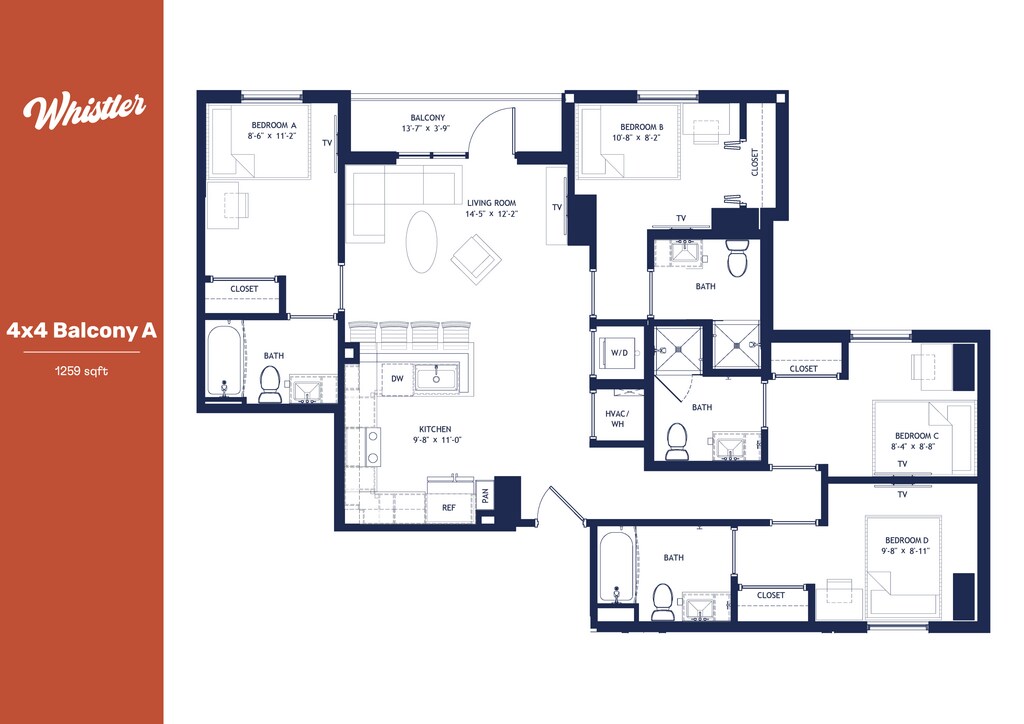 Apartment Model: 4x4 Balcony$1,6504 Bedroom, 4 Bath, 1258-1374 sq ftAvailable August 16, 2026![]()