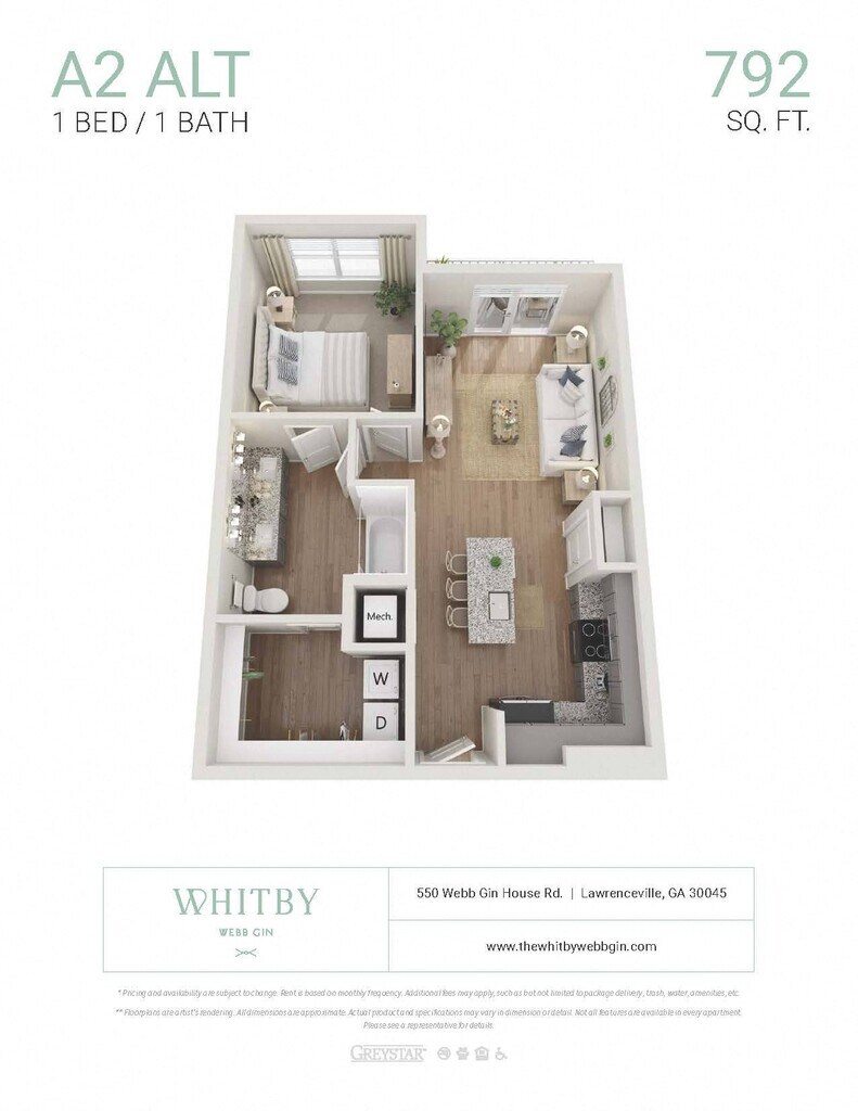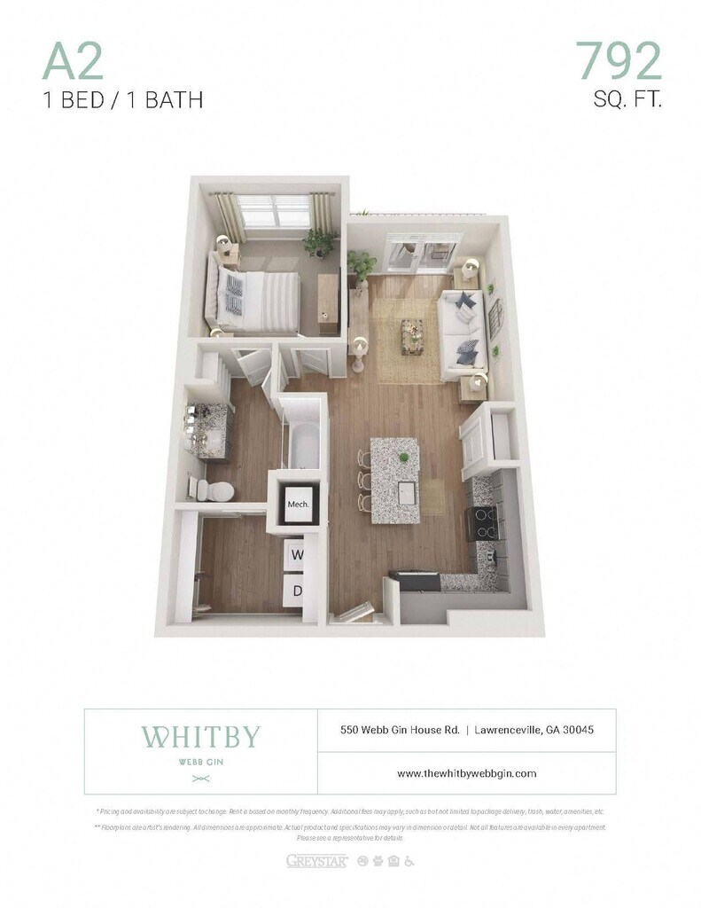 Apartment Model: A2 ALTFrom $1,5661 Bedroom, 1 Bath, 792 sq ftAvailable NowFloor plans are artist's rendering. All dimensions are approximate. Actual product and specifications may vary in dimension or detail. Not all features are available in every rental home. Prices and availability are subject to change. Base rent is based on monthly frequency. Additional fees may apply, such as but not limited to package delivery, trash, water, amenities, etc. Deposits vary. Please see a representative for details.
