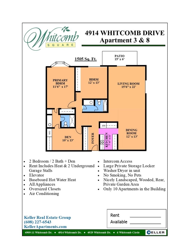 Whitcomb Square Senior Apartment Homes (for ages 55+) offers modest elegance the way you always wanted it. You'll have all the conveniences you've always wanted. No more worrying about repairs, maintenance, shoveling, mowing, property taxes or rising heat costs. Located on the west side of Madison in quiet Orchard Ridge Neighborhood. Enjoy a bike ride or stroll on the Southwest Commuter Path nearby. Reasonable Rent includes heat, private storage locker and underground garage.