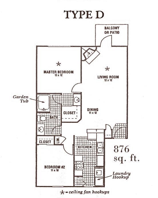 D - Floorplan 1 Apartment Unit: 1stFloorApartment Model: D$1,0602 Bedroom, 1 Bath, 876 sq ftAvailable November 7, 2025