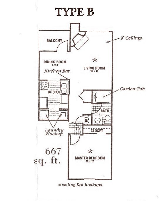 B - Floorplan 1 Apartment Unit: 3rdFloorApartment Model: B$9801 Bedroom, 1 Bath, 667 sq ftAvailable November 7, 2025$990