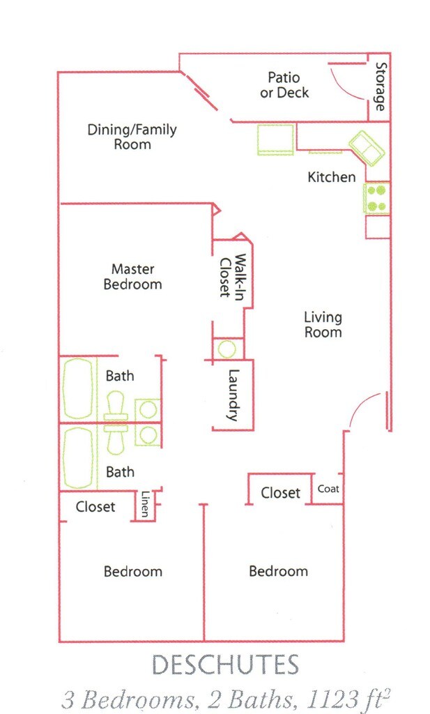 Apartment Model: DeschutesCall For Rates3 Bedroom, 2 Bath, 1123 sq ftUnavailableDeschutes - Floorplan 1 Willamette
