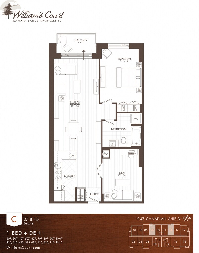 Apartment Model: 1 Bedroom + Den1 Bedroom, 1 Bath, 1015 sq ftUnavailable1 Bedroom + Den - Floorplan 1 2 Bedrooms